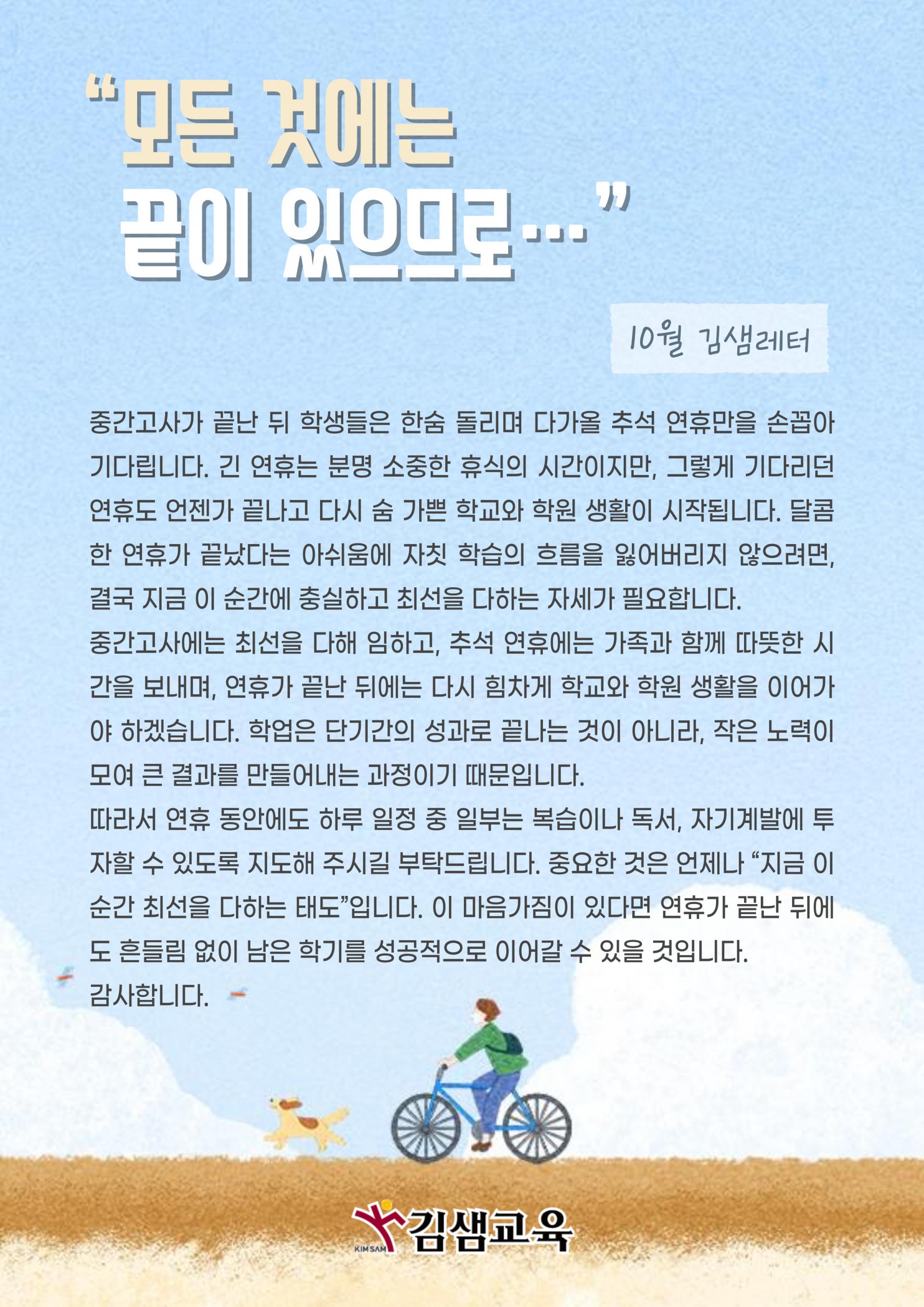 중간고사에는 최선을 다해 임하고, 추석 연휴에는 가족과 함께 따뜻한 시간을 보내며, 연휴가 끝난 뒤에는 다시 힘차게 학교와 학원 생활을 이어가야 하겠습니다. 학업은 단기간의 성과로 끝나는 것이 아니라, 작은 노력이 모여 큰 결과를 만들어내는 과정이기 때문입니다.